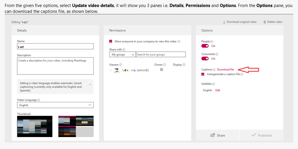 In addition, and on request, you can share a script of the video. Microsoft Stream can automatically run transcripts on the video. The author of the video (you) can go to Update vido details and download the .vvt file which is the transcript.