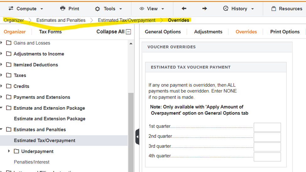Organizer| Estimates and Penalties | Estimated Tax/Overpayment | Overrides tab