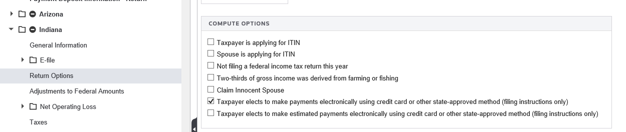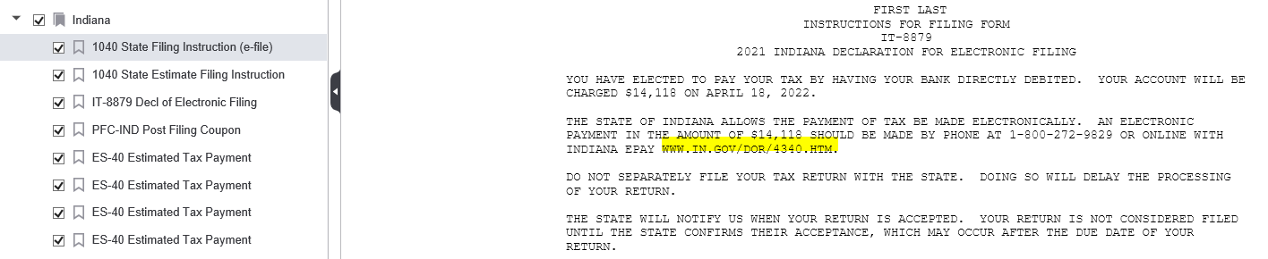 Organizer > States > Indiana > Return Options. If you mark the box ‘taxpayer elects to make payments electronically using credit card or other state approved method’ it will modify the instructions to show the website information. Presuming the templates are unmodified, the output will be as follows: